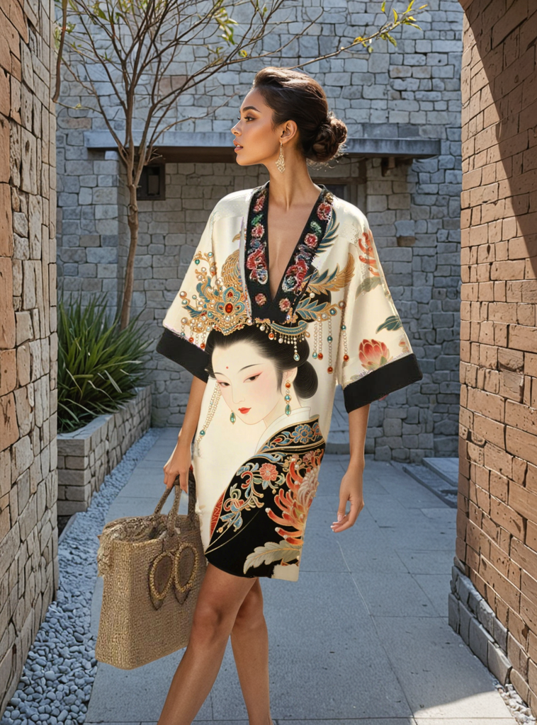 Design Note: Beautiful Chinese theatre elements pattern print, the version is loose v-neck short dress, fashionable and atmospheric.